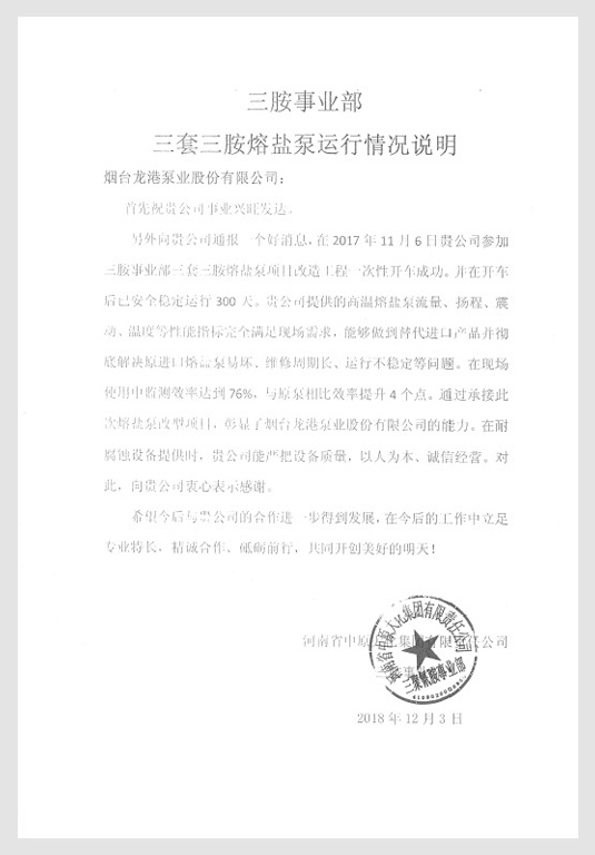 我司于2017年與河南中原大化公司達(dá)成合作協(xié)議,為其研發(fā)、生產(chǎn)的YLG200-400高溫熔鹽泵在現(xiàn)場已安全穩(wěn)定運(yùn)行2年,得到客戶的好評(píng)。
